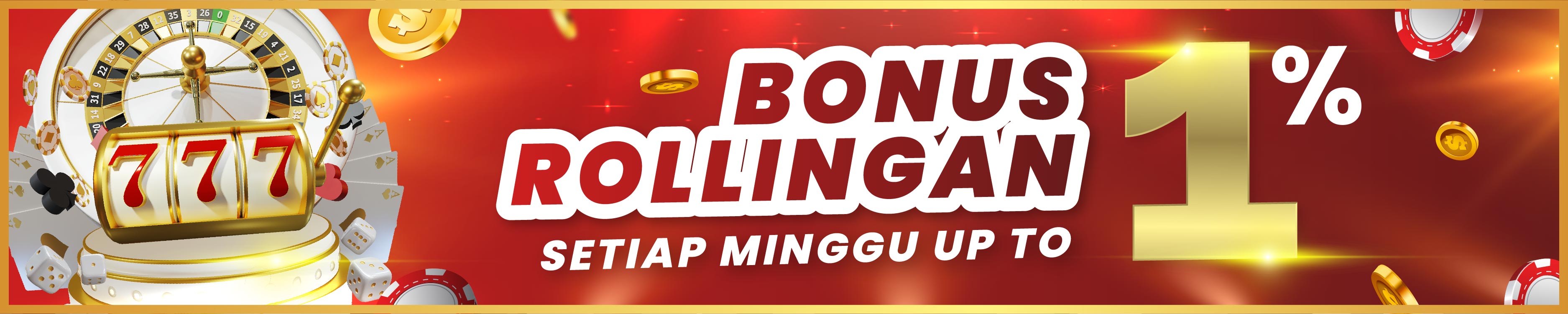 - Bonus Rollingan Up To 1% Berlaku untuk permainan Slot Game & Live Casino & Sabung Ayam.